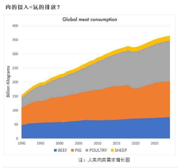 如上圖所示,由于人口增長(cháng)或飲食結構的改善,肉類(lèi)需求逐年遞增,2020年全球肉類(lèi)消耗量相比90年增長(cháng)了一倍多,而且預測仍然保持持續增長(cháng)。實(shí)際上,關(guān)于肉類(lèi)飲食與環(huán)境的相關(guān)性不僅僅存在于海洋氮輸入量。肉類(lèi)飲食上升與溫室氣體排放也密切相關(guān)。據估計,由于肉類(lèi)消耗量的增加,食品行業(yè)在2050年左右的碳排放量將會(huì )增加60%。因此,如何平衡我們對飲食改善的需求及環(huán)境保護似乎也是需要考慮和解決的矛盾之一,而可能的解決途徑包括基于植物或單細胞為基礎的替代肉品,以減少牲畜量;另外還包括綠色畜牧,像motral的產(chǎn)品或紅海藻這樣的飼料添加劑可以有效減少牛的甲烷排放,或者也可以在它們的飼料中加入更多的脂肪和蛋白質(zhì)進(jìn)而減少甲烷的排放。