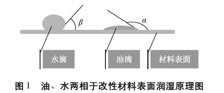 根據兩相液體在固體材料的潤濕角不同理論,兩相在接觸面體現出不同的潤濕角,當液體中的兩相在同一表面潤濕角之差大于70°時(shí)(α-β>70°),兩相可以分離。親油疏水改性材料表面使得油水兩相潤濕角大于70°,水相穿過(guò)材料表面而油相在材料表面大量聚集,最終得以粗?;?。