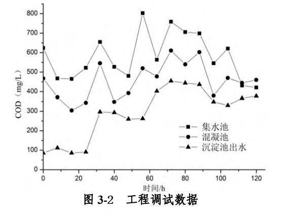 本工程于2017年11月調試完成,處理出水中的第一類(lèi)污染物執行《污水綜合排放標準》(GB8978-1996)表1標準。據表3-1,總鎘和總砷在處理后降低到原水的十分之一,達到了納管標準。處理出水中的第二類(lèi)污染物執行《污水綜合排放標準》(GB8978-1996)表4中三級標準。據表3-1,氟化物和COD處理后達到了納管指標;其中120h調試期間,沉淀池出水COD全部達到納管要求(圖3-2)。